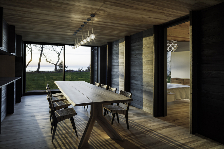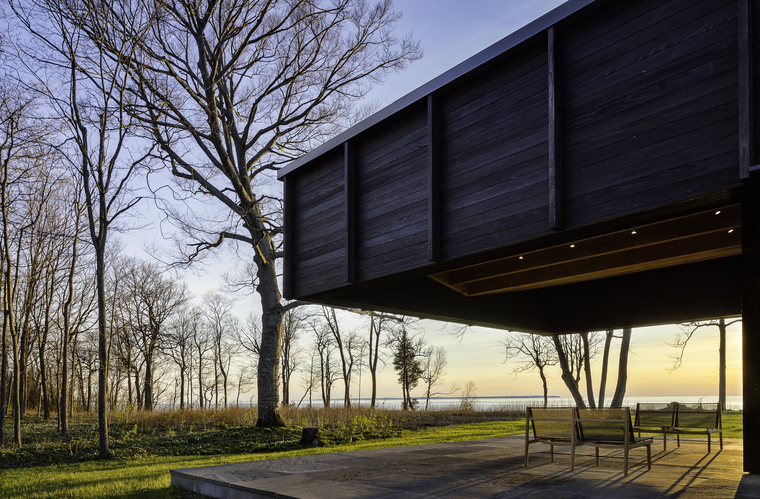 暴露在外的木梁擺放位置使得整個室內(nèi)空間里的拱頂看起來并不對稱。在小木屋的南端,6米長的懸梁屋頂延伸至觀景休息平臺,屋頂為其提供了一種保護(hù),同時對密歇根湖和周圍的美景一覽無余。