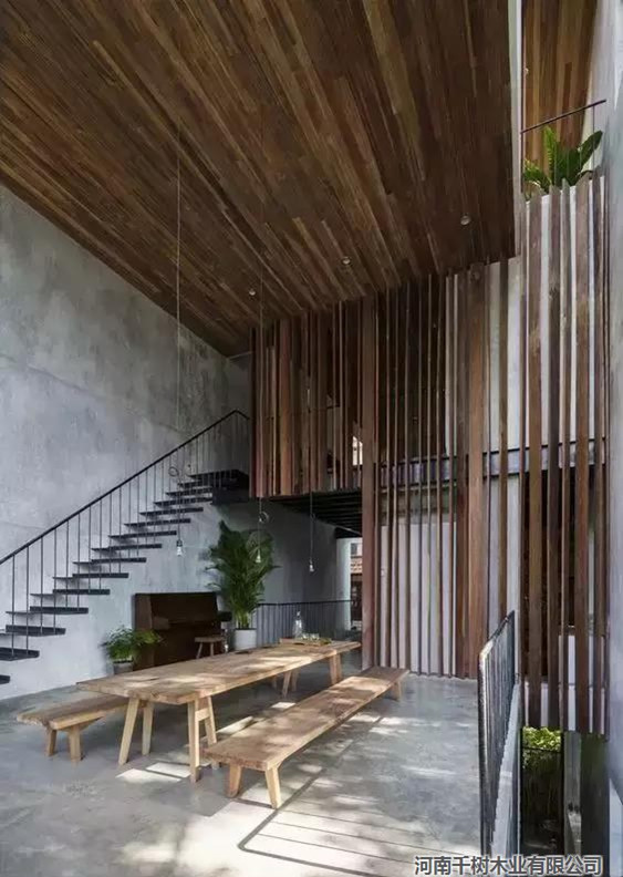 深色的木結(jié)構(gòu)與中式風(fēng)格家具結(jié)合融入混凝土,