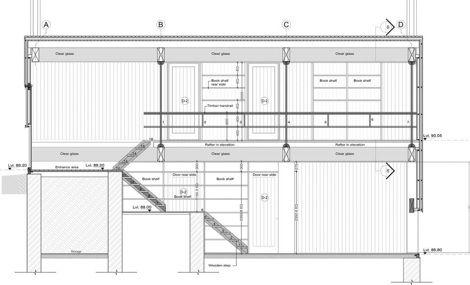 4個14.50 m跨度的sal木框架由多個膠合木板和薄鋼拉桿組成,支撐著整個用木材覆蓋的屋頂、隔熱的建筑外殼、整個木質(zhì)的夾層,并塑造了標(biāo)志性的雙層玻璃天窗。整個房子被懸掛在這些堅固的桁架框架中,沒有任何中間柱的支撐,使得一種不受干擾的地形輪廓流進(jìn)入靜謐的松木鑲板的室內(nèi)空間。精心雕琢的方形窗戶,朝向各個方向,讓使用者得以禪觀各個山峰和不斷變化的云。