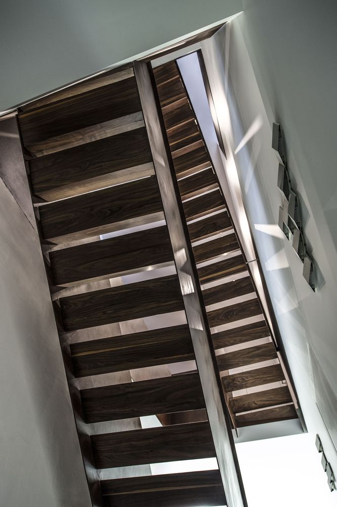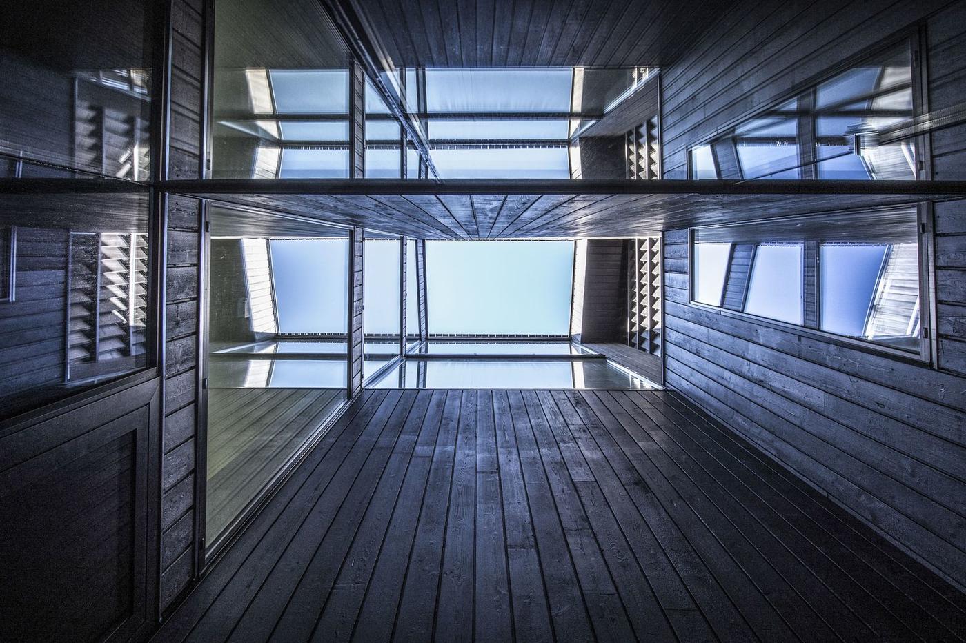 落葉松木板用于建筑主要外墻的百葉窗覆層系統(tǒng),以便保證地面層和2層的浴室擁有良好的視野。 用于外墻的落葉松木經(jīng)過(guò)特殊的加熱處理,以便保持顏色的持久并防止煙灰的附著。