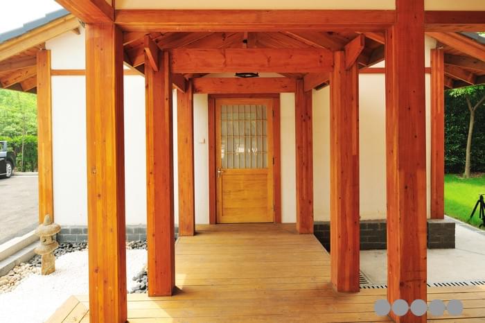 百花園日式木建筑四周有日式的圍廊和陽(yáng)臺(tái),但采用的是花旗松膠合主柱和鐵杉防腐木地板。一樓和二樓均采用了大面積的和式移動(dòng)門(mén)窗,裝飾以日本進(jìn)口的幛子紙,透光而不透視,而所有日式門(mén)窗均采用溫潤(rùn)細(xì)膩、耐腐抗變形的加拿大黃柏。循花旗松實(shí)木樓梯拾級(jí)而上,是日式茶室、辦公會(huì)客室、休息室和秘書(shū)室等功能區(qū)劃。整個(gè)室內(nèi)裝飾以針葉材實(shí)木板條和流白為主,地面是十分日本式的青石板,頂部的日式燈具均用直紋的花旗松實(shí)木在工廠定制而成。