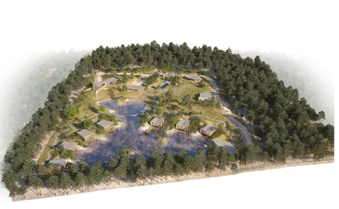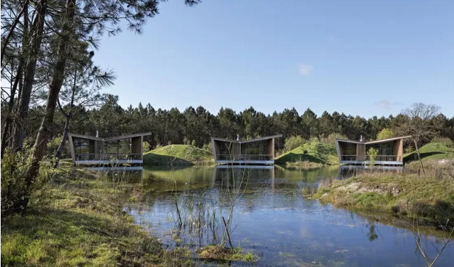 項目中所運用的斜線,以及接待處微微傾斜的角度與后面的圓形沙丘和線性冠層形成鮮明的對比。建筑與環(huán)境之間的和諧關系不是建立在模仿的基礎上,而是由一種截然相反的同源性來定義的。這些小的、獨立的單位被安置在水面上,它們是景觀中的一個重要的節(jié)點,與自然共同形成一個持續(xù)的有機環(huán)境。不同的路徑在山之間蜿蜒盤旋,以基地上各種不同的視角,你可以清晰地感覺到它的真實性。