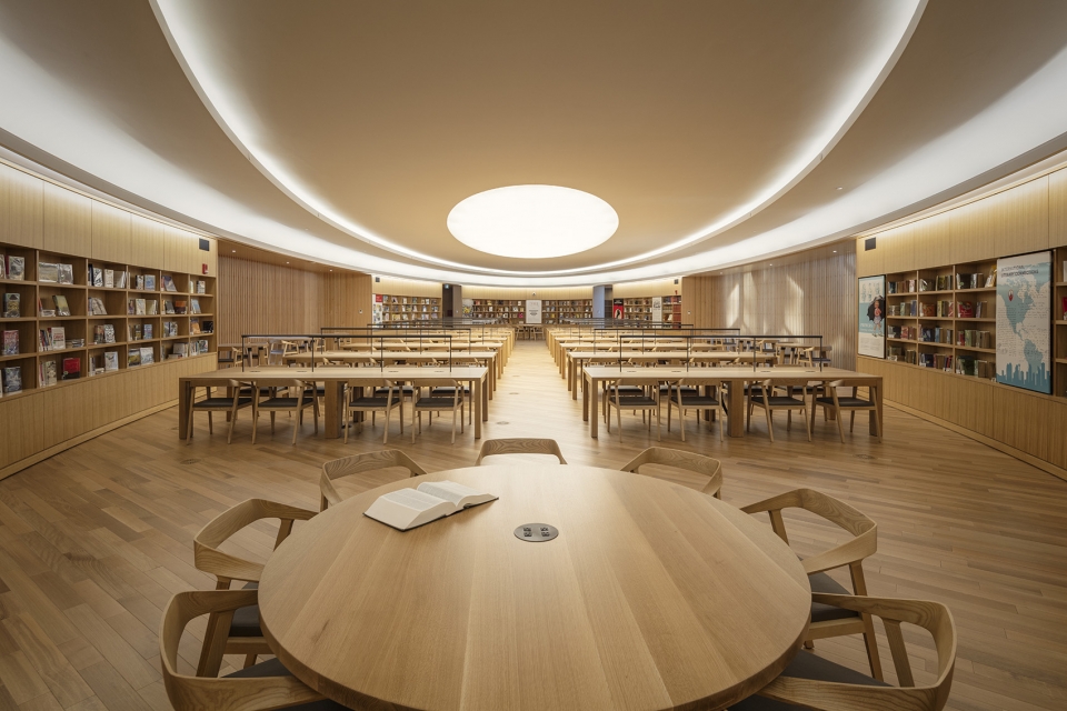 沿著拱門繼續(xù)走就走到了大廳和中庭,木質(zhì)樓梯蜿蜒而上,最高處距離地面有85英尺,通過巨大的“天眼”可以看到天空的景象。木質(zhì)格柵沿著開放式中庭的邊緣排列,從平面上看像是一個尖尖的橢圓,這樣布置可以讓人們能很快就明白圖書館的組織流線。圖書館內(nèi)部使用的混凝土是外露的,且不加任何修飾,隱喻著室內(nèi)空間的自由性。梁和柱的排列方式讓人聯(lián)想到古希臘建筑中用來聚會和知識交流的拱廊。保留材料的原始性,就是為了讓人們感覺到這個圖書館是一個大家能夠參與進(jìn)來的地方,而不是一個神圣的藏書閣。