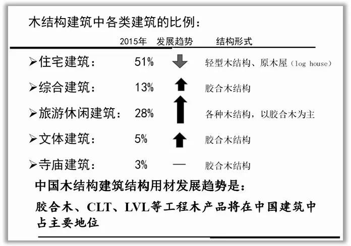 幾十年來,磚混結(jié)構(gòu)已廣泛應(yīng)用于我們的民用建筑中。施工成本低,給人以安全感,耐用性和低維護(hù)成本,而木結(jié)構(gòu)房屋不穩(wěn)定,不安全,易著火,易受害蟲害。遇水分會導(dǎo)致腐爛和霉變,因此難以接受這種新的木結(jié)構(gòu)建筑。由于對現(xiàn)代木結(jié)構(gòu)的理解不足,因而產(chǎn)生這些疑問是正常的。只要在成本,安全,保護(hù),功能等方面采取適當(dāng)措施,通過大量的實驗比較,專業(yè)知識的宣傳,樣板房的示范,特別是中國古代木結(jié)構(gòu)建筑和文化的影響,我相信人們的思想會發(fā)生變化,而木結(jié)構(gòu)建筑的生活體驗也會影響人們的固有觀念?,F(xiàn)代木結(jié)構(gòu)完全可以被接受。下圖所示的各類木結(jié)構(gòu)建筑發(fā)展趨勢也能說明這一點。