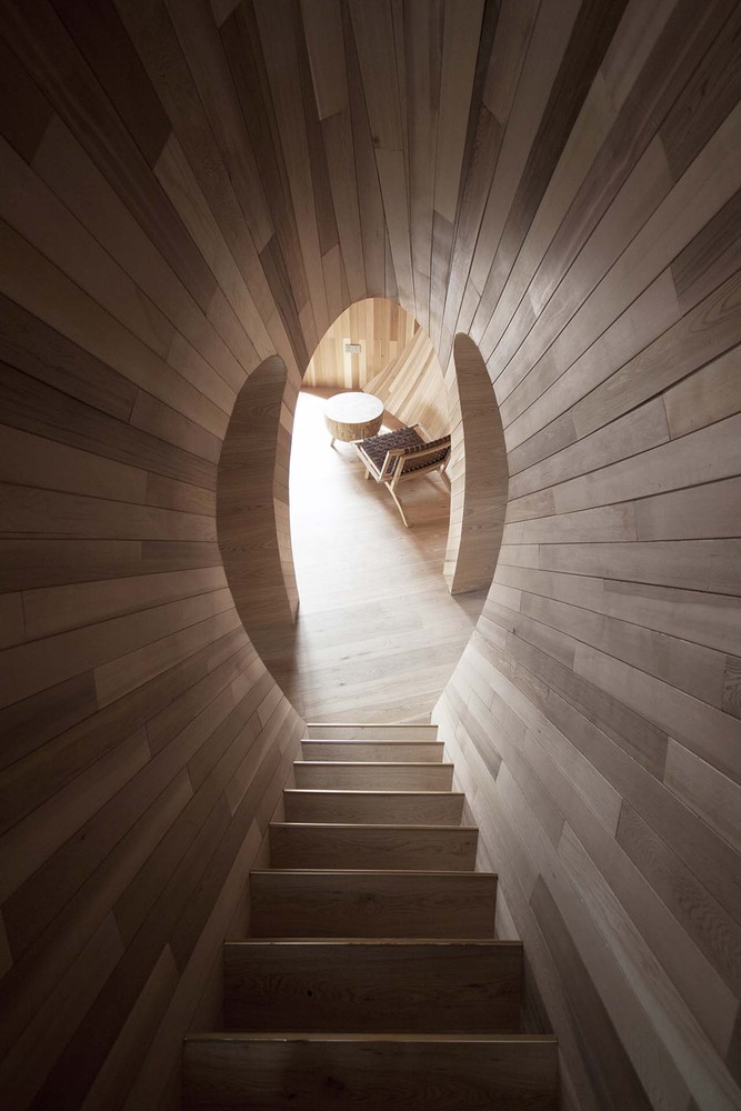 種子屋室內(nèi)墻面采用統(tǒng)一的木拼,自然的木色變化形成的條紋感,進一步強調(diào)橢球形態(tài)的空間感。主臥后側體量容納入口、衛(wèi)浴、儲藏等功能區(qū),同時形成親子區(qū)閣樓。閣樓與一層通過一個插入式的橢圓柱型樓梯間連接,同時樓梯間與入口空間穿插,形成有趣的異形空間。