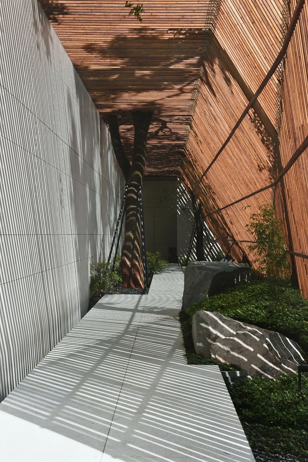 屋頂用原先木架尺寸的竹鋼梁架搭接,椽子采用十字交叉竹鋼構(gòu)件組合,在小院的正上方勾勒出葫蘆形的輪廓,通透的竹鋼板屋面一方面呼應(yīng)了原有屋瓦的尺度,又形成屋面中間更為通透的效果,給屋中小院引入充足的陽光,便于樹木生長。