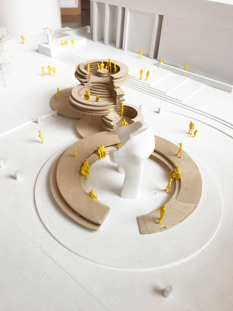 IKD給Cleo Rogers紀(jì)念圖書館廣場的設(shè)計方案,題目是對話基座 (Conversation Plinth),其目的是為了向 J Irwin Miller 致敬并慶祝哥倫布社區(qū)。它的形式是受 Miller House 談話的正廳的啟發(fā), 同時他的“基座”抬高并強(qiáng)調(diào)了場地周圍的重要地標(biāo)建筑-貝聿銘設(shè)計的圖書館,由薩里寧設(shè)計的第一個基督教堂,和亨利.摩爾設(shè)計的 Large Arch。