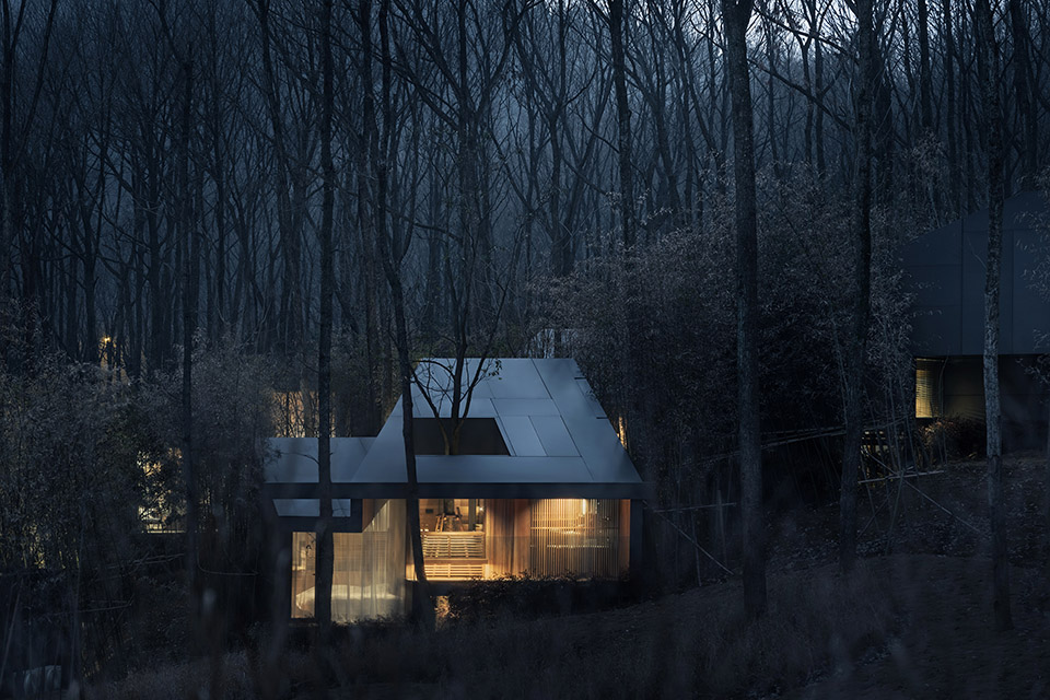 每個(gè)小屋中都保留了一棵場(chǎng)地原生的樹(shù)木,樹(shù)木所占據(jù)的空間成了屋中院,透過(guò)玻璃時(shí)刻于室內(nèi)生活相伴,是自然向建筑的反向滲透,屋中院也為室內(nèi)衛(wèi)生間提供了具有私密性的風(fēng)景。