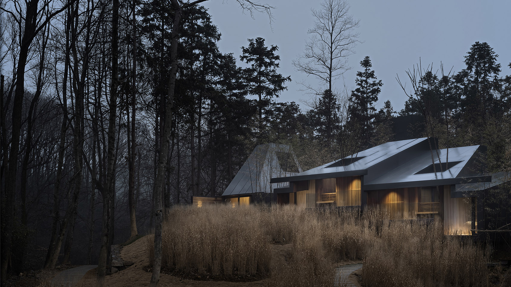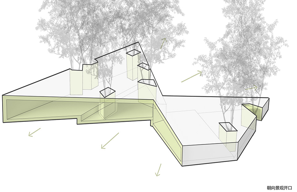 建筑的另外兩側(cè)分別嵌入山體之中,架空的蝶狀建筑的下方仍然保留了溪水和山路的通道。為了將部分樹(shù)木保留在室內(nèi),豎向結(jié)構(gòu)被設(shè)計(jì)成“柱院”,結(jié)構(gòu)意義上是柱子,空間意義上,是保留了一棵樹(shù)的“微院”。屋面是一個(gè)臺(tái)階狀的坡屋頂,可作為小型演出的森林劇場(chǎng),室內(nèi)空間被這個(gè)大坡屋頂統(tǒng)一起來(lái),并因?yàn)椴煌孛鏄?biāo)高的變化而富有節(jié)奏。