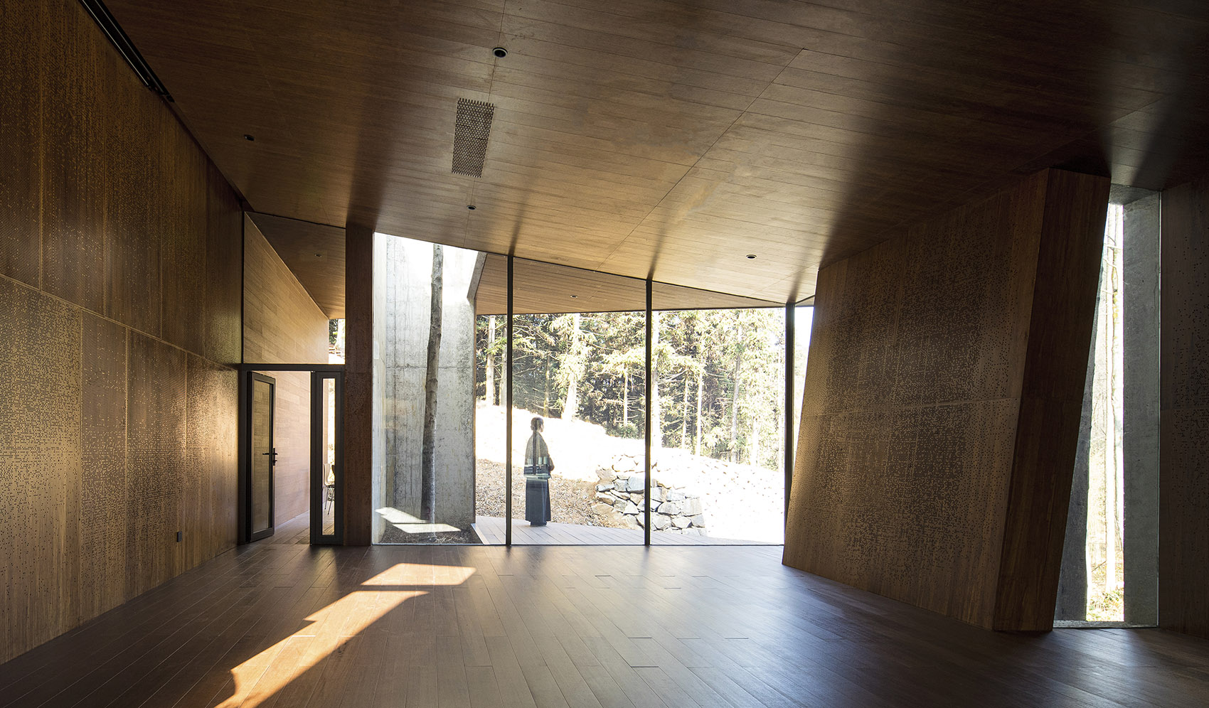 內(nèi)部每個(gè)標(biāo)高的空間,都有相應(yīng)的落地玻璃立面,錐形的頂部設(shè)置了可以看向天空和樹(shù)冠的天窗,形成了分別朝向不同的方向看風(fēng)景的組合,將外部的景觀投射到整個(gè)空間內(nèi)部,外部的風(fēng)景成了建筑的主要元素,形成空間特有的張力,這一切都是為了居于室內(nèi)可以獲得對(duì)自然更多的感知。
