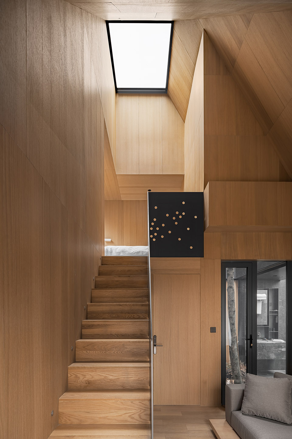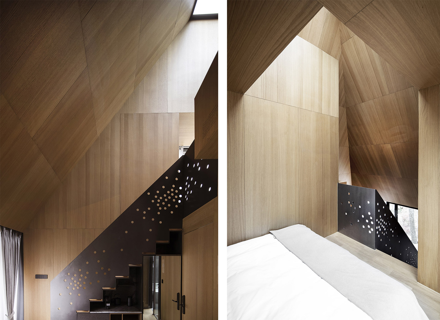 空間的大小是以人的基本尺度來(lái)定義的,建筑的墻面和屋頂都觸手可及,這種微小的尺度讓人時(shí)刻感受到建筑處于自然之中。這種接近于野營(yíng)帳篷的空間體驗(yàn),希望讓人時(shí)刻感受到自然就近在咫尺,只是隔了一層外墻的厚度。通體的木質(zhì)材料提供了溫暖而舒適的建筑內(nèi)襯,給人提供了舒適而愜意的生活氛圍,這和外部自然的野趣形成的強(qiáng)烈的反差,這種反差讓人對(duì)自然保持敏感,更能感受到自然之美,或溫柔細(xì)膩,或爆裂冷峻。