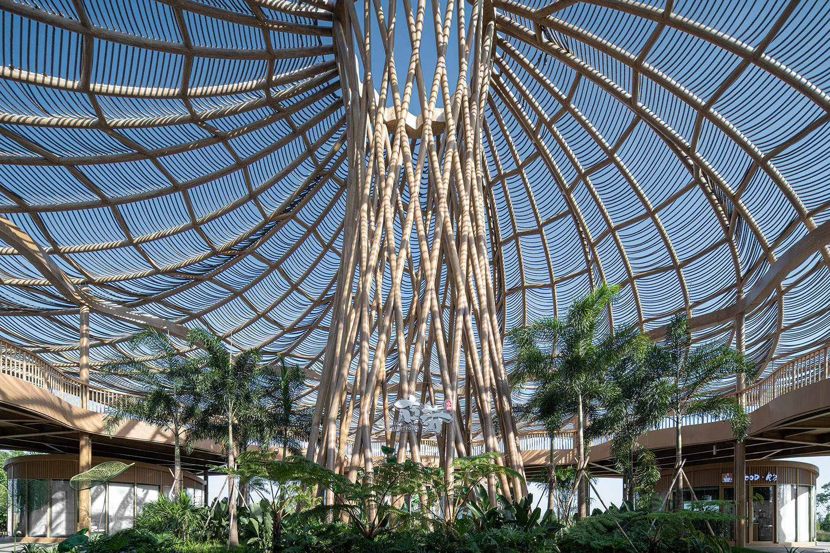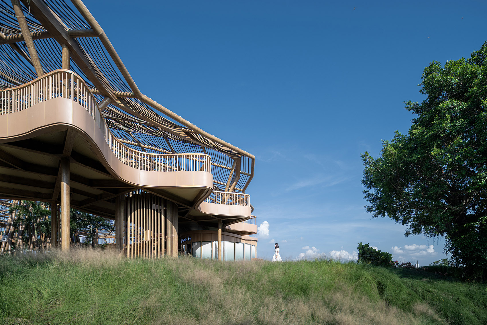 屋頂采用當?shù)靥烊徊牧下槔K遮陽,在保證了整體建筑完整性的同時,將地域生態(tài)的材料用現(xiàn)代懸掛的形式呈現(xiàn),提升了屋頂觀覽區(qū)的觀賞性,使整個建筑也成為了一道靚麗的風景線。